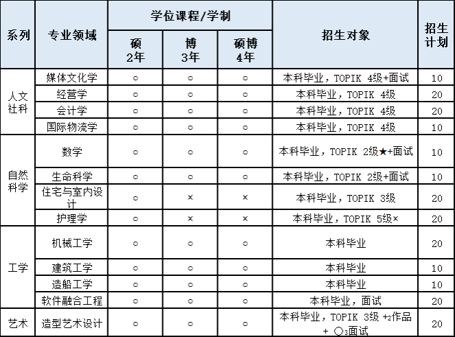 其他专业需TOPIK 三级或群山大学语言研修课程4级以上