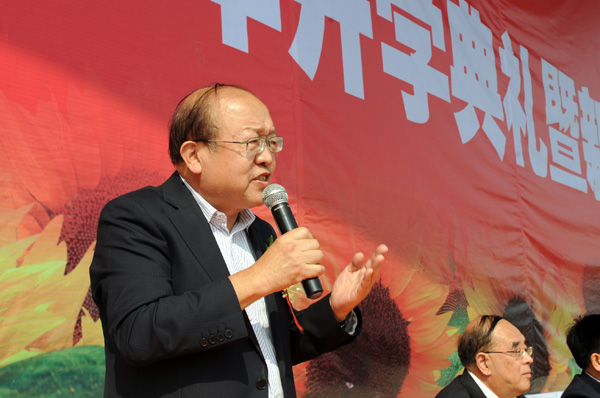 开学典礼结束后,吕明董事长宣布2013级新生军训汇报开始并在军训团首长的陪同