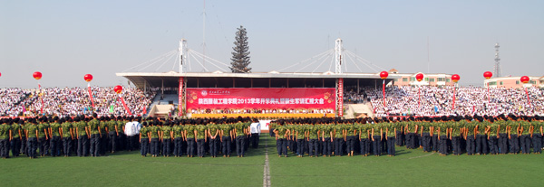 秋高气爽,硕果飘香。9月15日上午,学校田径场彩旗招展,歌声飞扬,主席台两侧16个红色气球载着大幅标语迎风飘荡,几十盆鲜花鲜艳夺目,我校盛大的2013学年开学典礼暨新生军训汇报大会隆重举行。一大早,三千多名2013级新生身着军训戎装整齐列队在田径场内,怀着兴奋和期待的心情,接受检阅,五千多名11级、12级学生和全院教职工坐满了看台,共迎新的学年。
