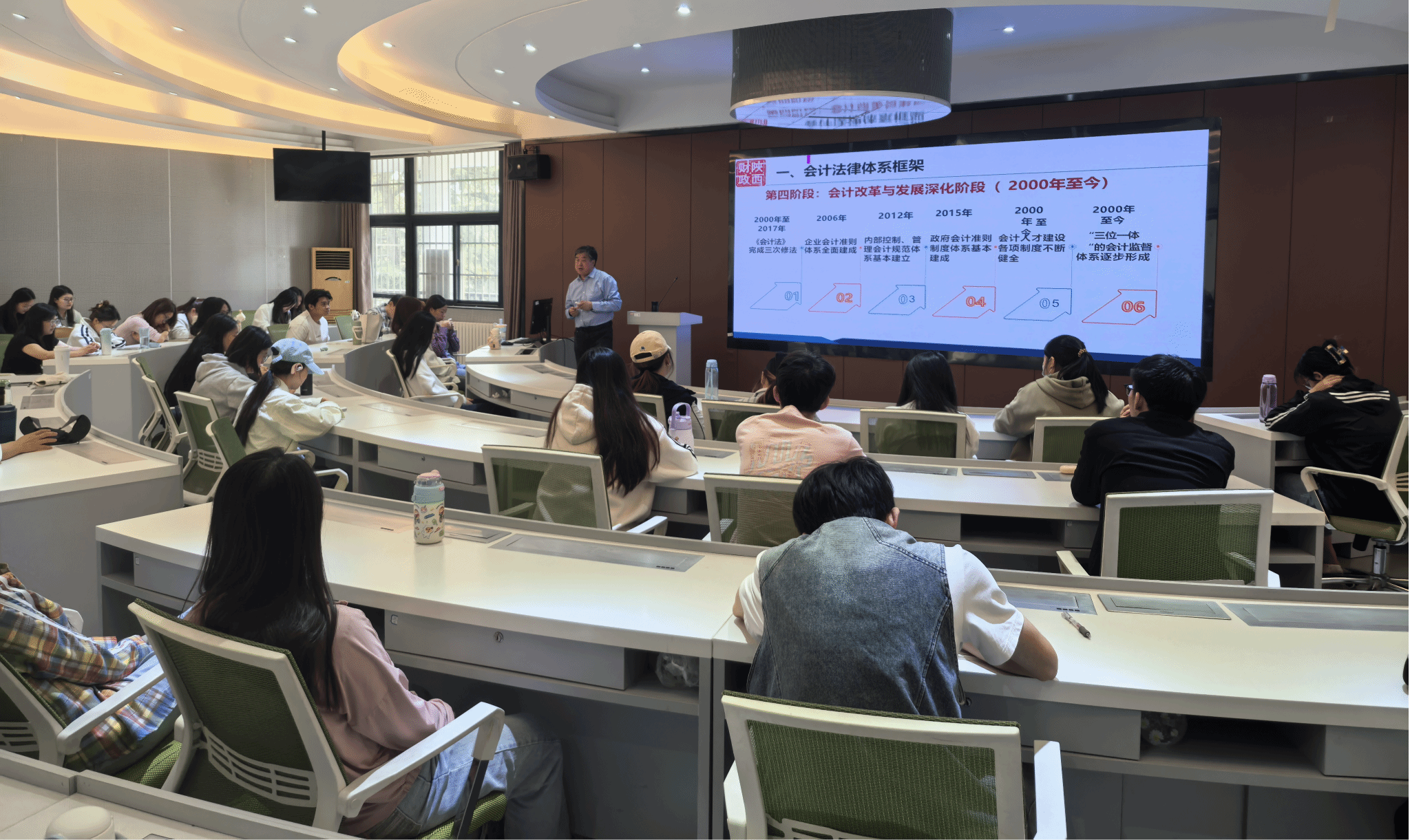 讲座中,徐教授围绕新《会计法》展开深入解读。他先介绍了会计法律体系框架,梳理了会计法的立法依据、立法历程以及会计法律体系的构成,让同学们对会计法的基础架构有了清晰认识。谈及修法背景和过程时,徐老师指出,此次修法是基于法制中国建设、财会监督制度建设等多方面需求,历经立项启动、调研起草、审议审查和表决等阶段才得以完成。